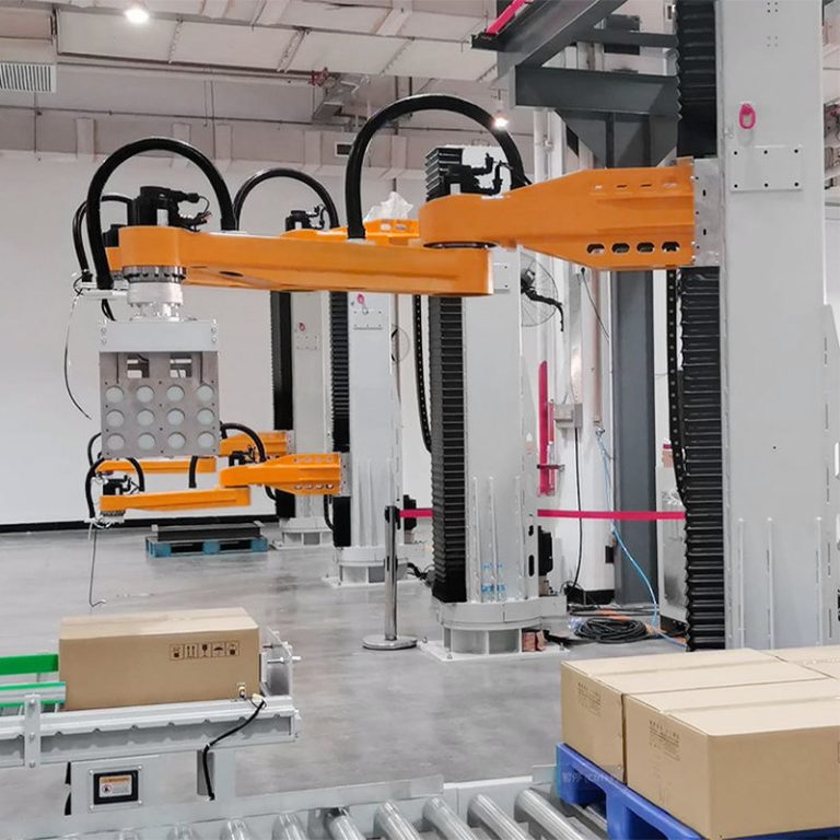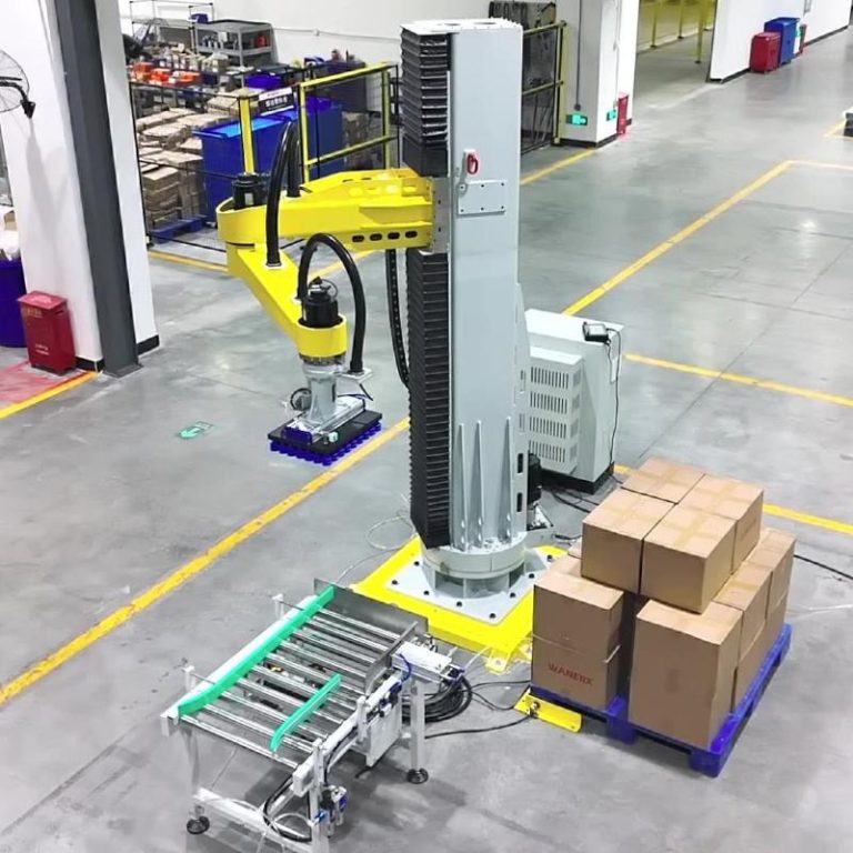Máy có thể được sử dụng độc lập hoặc kết hợp với máy xếp pallet tự động và băng tải pallet để tạo thành một hệ thống xếp pallet hoàn toàn tự động